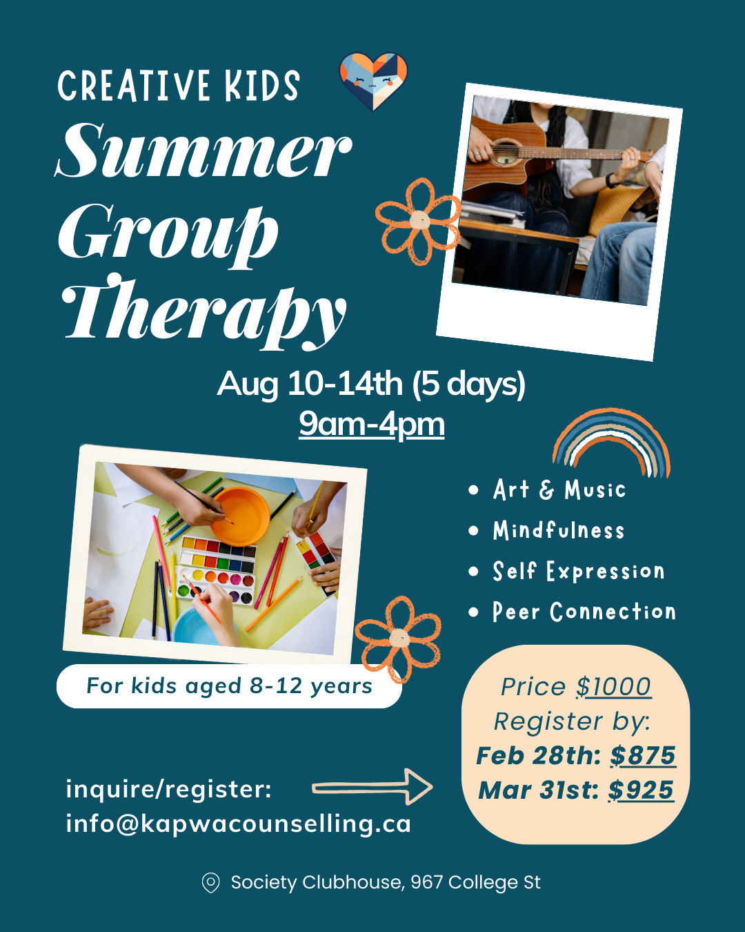 Hey Toronto Families! Here’s an alternative to a summer camp week. It is week‑long summer offering is a creative arts‑based group psychotherapy program for children ages 8-12. Located in Toronto’s West End, The program provides a consistent daily structure that supports emotional regulation, confidence, coping skills, and peer relationships through art, music, movement, and group reflection.